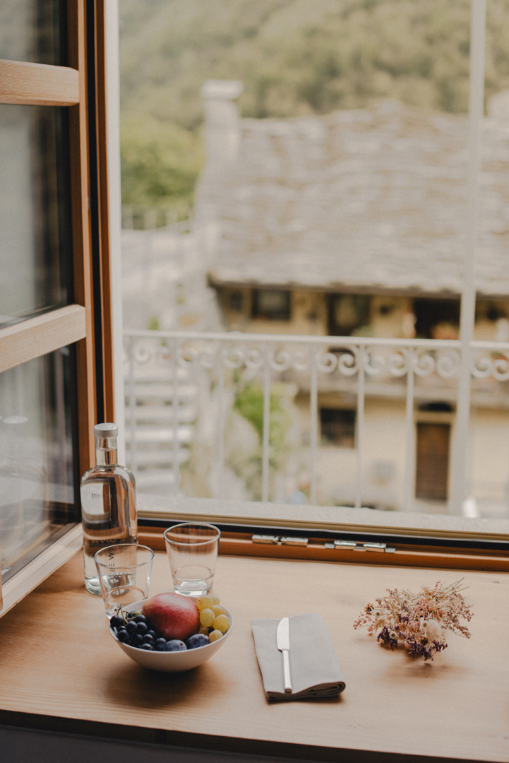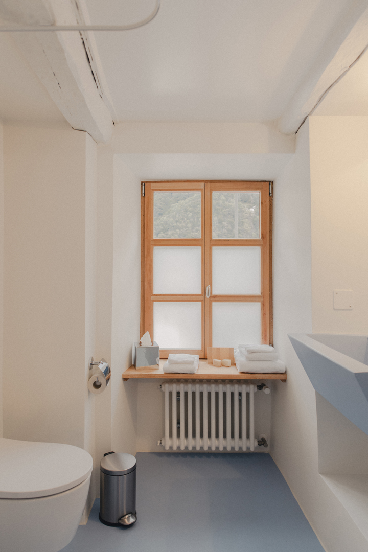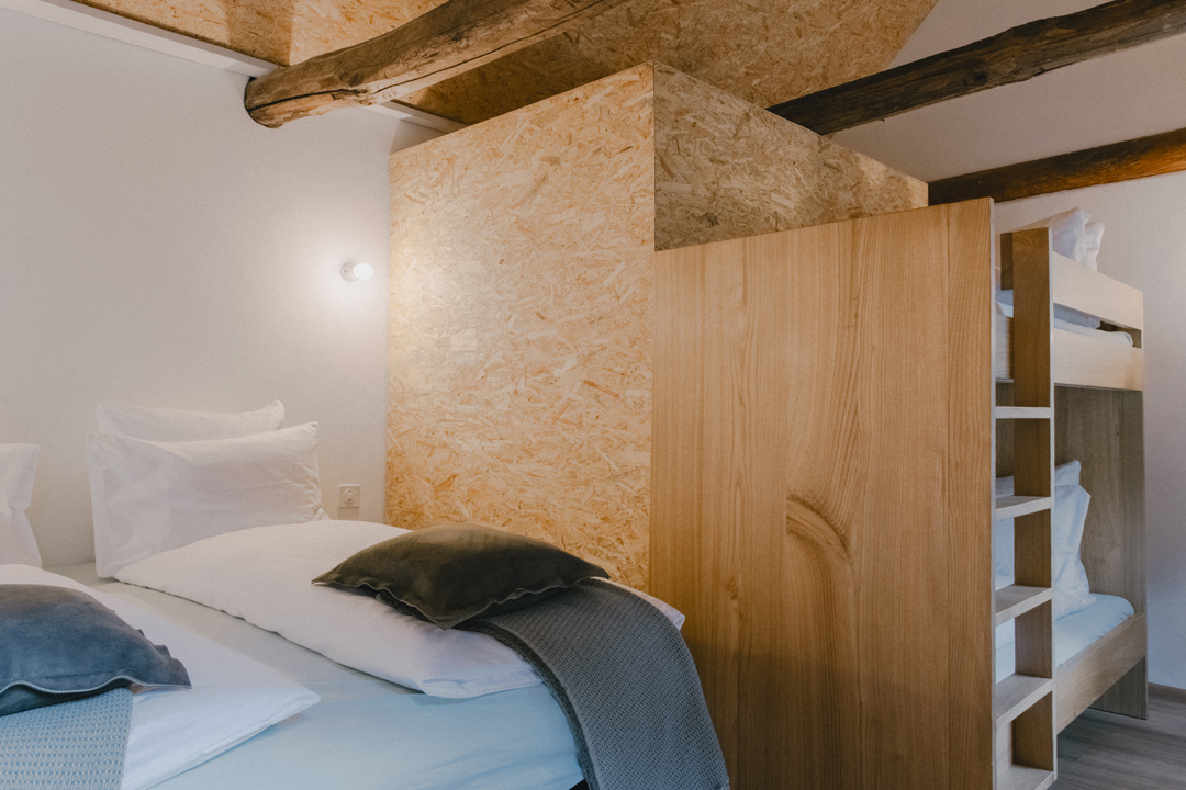 Familienzimmer mit eigenem Bad, Garten Zimmer für 4 Personen 17 m² Doppelbett 160×190 cm Etagenbetten 80×190 cm eigenes Badezimmer mit offener Dusche, Waschbecken und WC Garderobe Haartrockner Garten mit Talblick